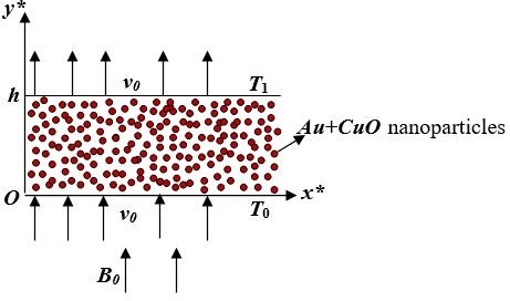 The flow model of the current study is presented in Fig. 1. Let us assume that the bottom wall coincides with the is normal to it. An applied magnetic field of magnitude B0is entreated uniformly orthogonal to both walls. T1 and T0 are the wall temperatures of upper and lower walls, respectively (T0< T1.), and . is the distance between the walls. The fluid is injected through the bottom wall with a velocity .vo. and sucked out from the top wall at the same rate. The constitutive equations concerning the force stress tijand the rate of deformation tensor dijare given by [6, 27]