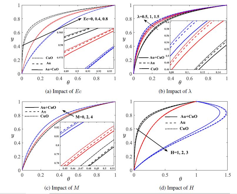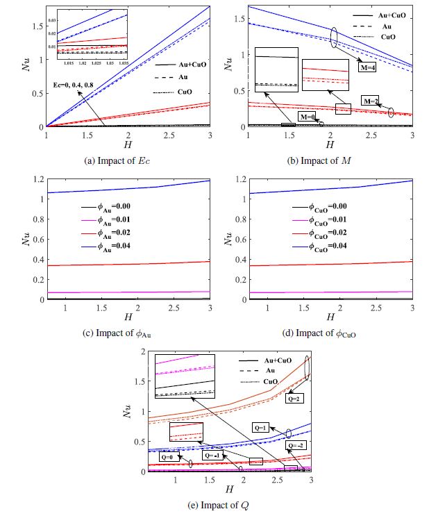 Figures 4(a)–4(e) are plotted to see the influence of emerging parameters Ec, M , gold nanoparticles volume fraction, copper oxide nanoparticles volume fraction,