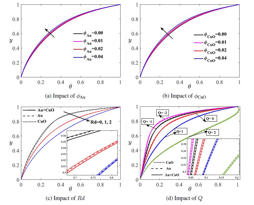 From Figs. 3(a) and 3(b) one can understand that increasing volume fraction of nanoparticles Au, CuO lead to the deceleration in the temperature distribution. From Fig. 3(c)it is apparent that the raising of the radiation parameter increases the temperature of thecurrent working fluid due to the radiation parameter has the relative commitment to thethermal transmission of conductive heat. Figure 3(d) displays the temperature distribution