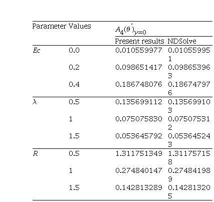 A comparison is made between the results obtained by present scheme with the results of Radhakrishnamacharya and Maiti [16] and with the results obtained by NDSolve forfor the Newtonian fluid case in the absence of nanoparticles, applied magnetic field, and thermal radiation, which are presented in Table 2. The comparison shows that there is a good agreement between the present results, the results of Radhakrishna- macharya and Maiti [16], and the results obtained by NDSolve using MATHEMATICA software. Further, to check the correctness of the present results we made a comparison between the present results and the results obtained by NDSolve using MATHEMATICA, which are given in Table 3. It is observed that there is a good agreement between the present results and the results obtained by NDSolve.