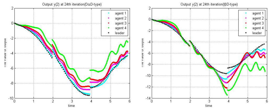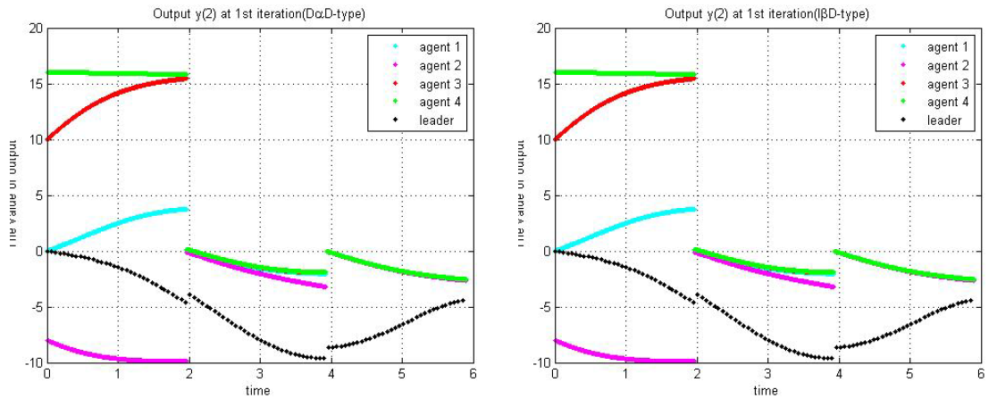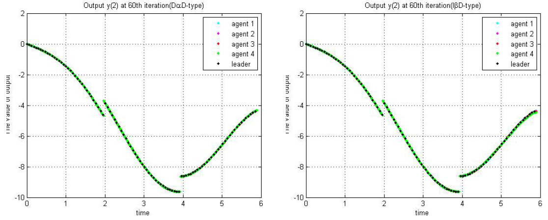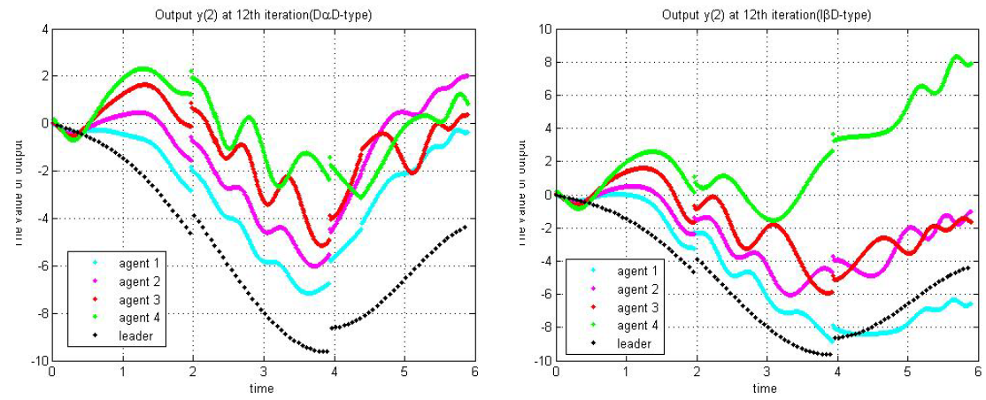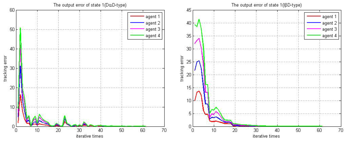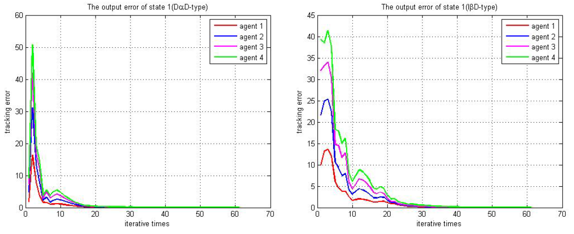 Theorems 1–4. Therefore, the multi-agent system can uniformly track the target trajectory under the given learning control. Figures 2 and 3 show that the error between the output value and the target trajectory gradually converges to 0.