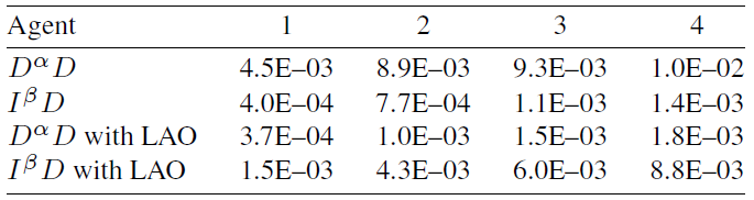 When the iteration reaches 60, the consensus errors of four learning laws are shown in Table 1. It should be noted that the error correction method of