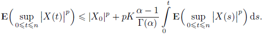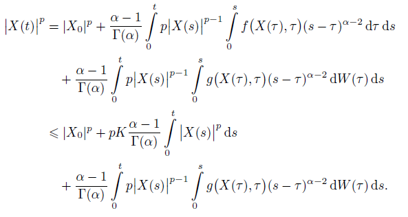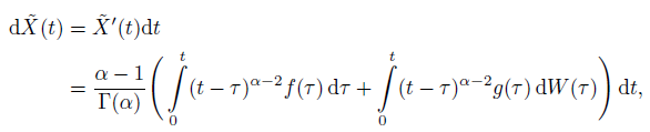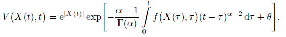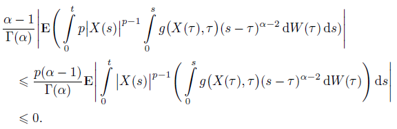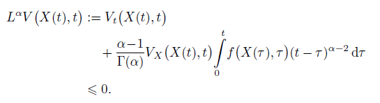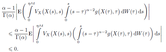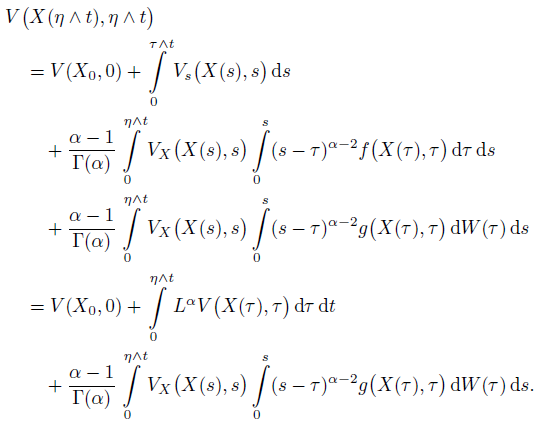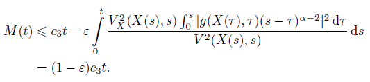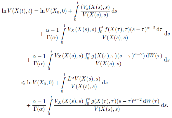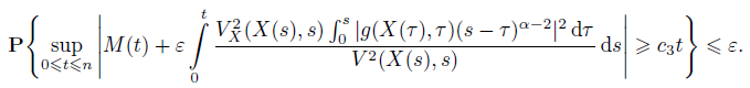 Set M (t) = ∫0 t(Vx (X(s), s) ∫0 s g(X(τ ), τ )(s−τ )α−2 dW (τ )/V (X(s), s)) ds. Then let n = 1, 2,….. For arbitrary ε ∈ (0, 1), by (V3)(iii) we can get