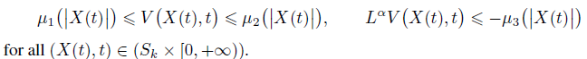 (V2) The positive definite decreasing function V ∈ C2,1(Sk × [0, +∞); R+) such that LαV < 0, α ∈ (1/2, 1), where LαV is defined in (5).