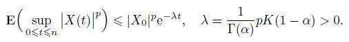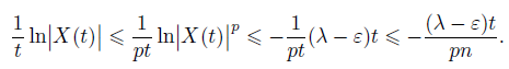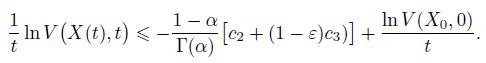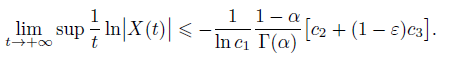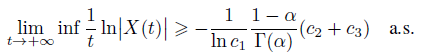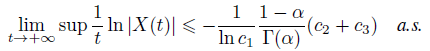(10)If c2 + c3 < 0, then - (1/ ln c1)((1 - α)/Γ(α))(c2 + c3) > 0. Thus, almost all the sample paths of X(.) will tend to infinity (see (10)), i.e., the trivial solution of (1) is almost surely exponentially unstable.