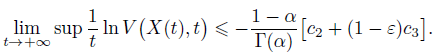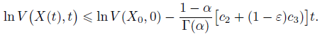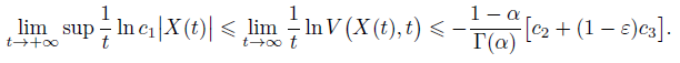 Note that c1 > 1, then, if c2 + c3 > 0, we have - (1/ ln c1)((1 - α)/Γ(α)) (c2 + c3) < 0. By Definition 5 the trivial solution of (1) is almost surely exponentially stable.