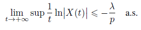 Definition 6. (See [15, Def. 4.1].) The trivial solution of (1) is said to be pth moment exponentially stable if there is a pair of positive constants λ and C such that E( │X(t)│ p) ≤ C │X0│ pe−λt for all t ≥ 0, X0 ϵ R. If p = 2, then it reduces to exponentially stable in mean square.