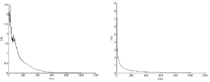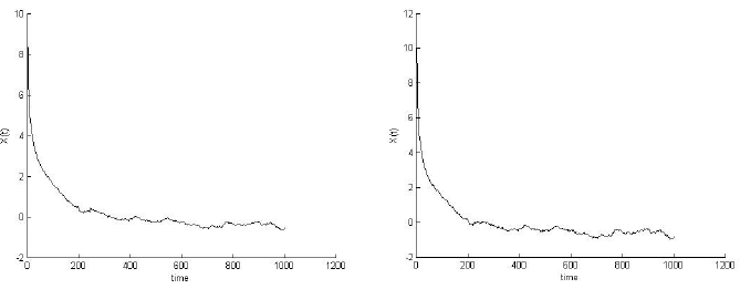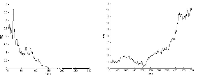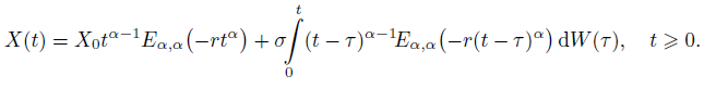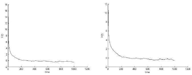 If X0 > 0 and X0 ≠ ∞, according to the results for asymptotic behavior of Mittag-Leffler functions in [7], the solution of (15) is exponentially decaying under the disturbance of white noise.
