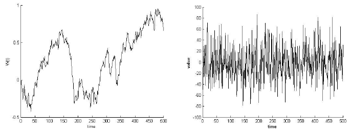 Let r and β be constants when α = 1, f (X, t) = rX and g(X, t) = βX, the solution of (12) can be see in [15, Ex. 5.5]. Our chosen Brownian motion and white noise are shown in Fig. 1. Using MATLAB software, trajectories of stochastically stable on r < β2/2 and r > β2/2 and corresponding unstable results are shown in Fig. 2.
