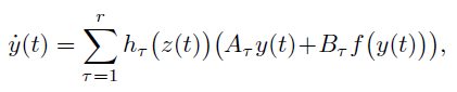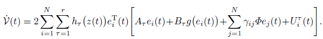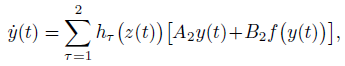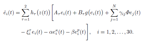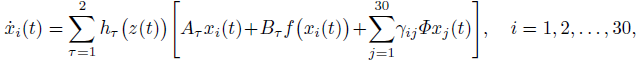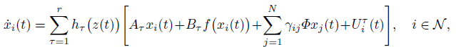 (2)where N = {1, 2, . . . , N }, N is the number of nodes, xi(t) = (xi1(t), xi2(t), . . . , xin(t))T ∈ Rn and y(t) = (y1(t), y2(t), . . . , yn(t))T ∈ Rn denote the state vectors, f (.·) : Rn → Rn is a continuous function, Aτ , Bτ ∈ Rn×n are constant matrices. Γ = (γij) N x N satisfies γij ≥ 0 for i ≠ j, γij = - ∑Nj=1, j ≠ i γij, and ϕ = (Φij) nxn is inner-coupling matrix. z(t) = (z1(t), z2(t), . . . , zµ(t))T, zj and Mτj (τ = 1, 2, . . . , r, j = 1, 2, . . . , µ) are the premise variables and the fuzzy sets. Moreover,