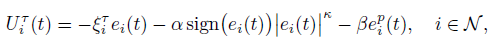 (3)where τ = 1, 2, . . . , r, κ = q if Σi=1N ǁei(t)ǁ2 ≥ 1; otherwise, κ = 1. q > 1 and 0 < p < 1, ξiτ is constant to be determined. α > 0 and β > 0 are tunable constants. sign(ei(t)) = diag(sign(ei1(t)), sign(ei2(t)), . . . , sign(ein(t))), |ei(t)|κ = (|ei1(t)|κ, |ei2(t)|κ, . . . , |ein(t)|κ)T, and ei1p(t) = (ei1p (t), ei2p (t), . . . , einp (t))T.