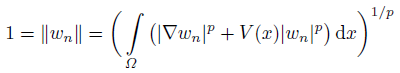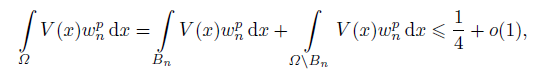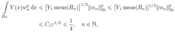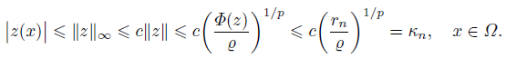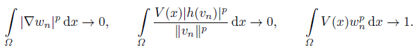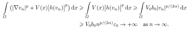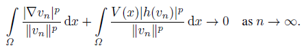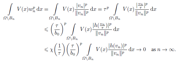 (10)Set wn = vn/ǁvnǁ, then ǁwnǁ = 1. Noticing the compactness of embedding E ‹→ Ls for s ∈ [1, +∞) up to a subsequence, we have wn(x) w(x) in E, wn(x) → w(x) in Ls(Ω) for s ∈ [1, +∞) and wn(x) → w(x) a.e. on Ω. It follows from (10) and