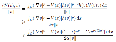 (16)It follows from N < p ≤ 2α, N ≥ 2, (15) and (16) that limǁvǁ→∞ Φ′(v), v / v = , which implies that Φ′ is coercive. The fact that Φ′ is hemicontinuous can be verified using standard arguments. In addition, with the help of Theorem 26(A) in [20], as well as J(v) = I(h(v)) and the inequality