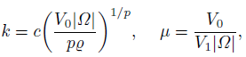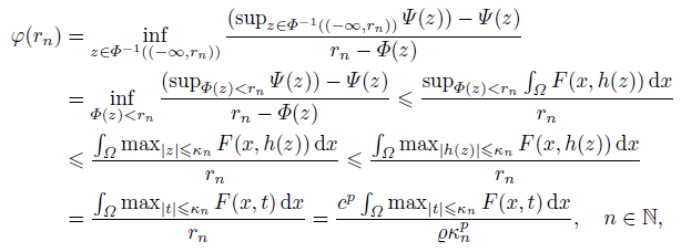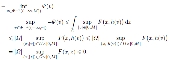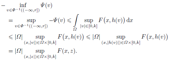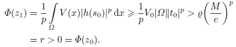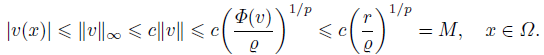 (17)Next, we focus our attention on the case when v ∈ E with Φ(v) ≤ r. By (7) and (8) we have r ≥ Φ(v) ≥ Qǁvǁp ≥ Q(ǁvǁ∞/c)p, which implies that |v(x)| ≤ c(r/Q)1/p = c(V0|Ω|/(pQ))1/p = k for all x ∈ Ω. The above inequality and (h3) of Lemma 1 yield