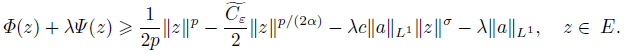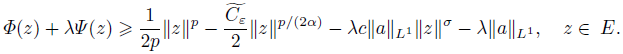 Since 0 < σ < p ≤ 2α, we have limǁvǁ→∞(Φ(z) + λΨ (z)) = ∞, and (i) is verified.