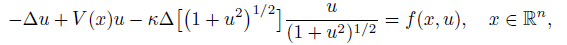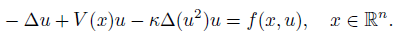 (2)where z : R x Rn → C, V : Rn → R is a given potential, h and g are real functions, κ is a real constant. Putting z(t, x) = e−iβtu(x) in (2), where β R and u(x) > 0 is a real function, the quasilinear equation (2) reduces to the following modified elliptic form: