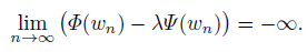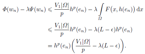 It follows from the choice of ϵ that V1|Ω|/p − λ(L − ϵ) < 0, and then one gets limn→∞(Φ(wn) − λΨ (wn)) = −∞.