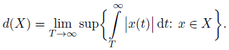 and by L1loc(R+) the Fréchet space of all locally integrable spaces on R+ endowed with a family of seminorms ǁxǁ = ∫0 T |x(t)| dt (T > 0). A nonempty set A in L1loc(R+) is bounded if it is bounded in every seminorm, i.e., supT>0{ǁχ[0,T ]xǁT : x ∈ A} < ∞.