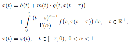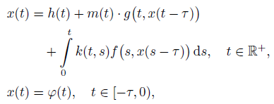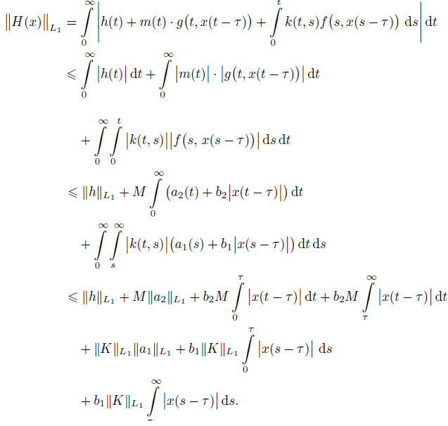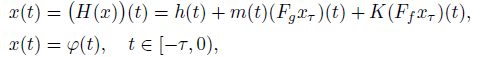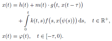 (6)where xτ = x(t − τ ), τ < t, Kx(t) = ∫0t k(t, s)x(s) ds, and Ff , Fg be the superposition operators generated by f and g, respectively. Note that if ϕ is integrable, then for any integrable function x, a function xτ is integrable too.