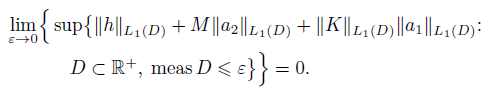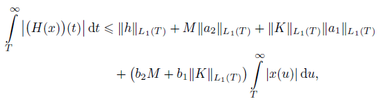 where the symbol ǁ·ǁL1 (T ) denotes the operator norm acting from the space L1[T, ∞) into itself. Because T → ∞, by the definition 5 we get