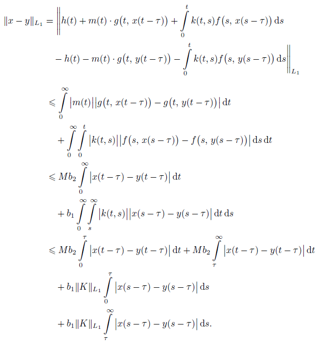 where the symbol K L1 (D) denotes the norm of the operator K acting from the space L1(D) into itself. Recall that D is arbitrary, so the set D ∩ [0, τ ] need not be empty. Then the above estimation require the use of assumption (i) as for such points we get t - τ ϵ [ - τ, 0], on this interval, we have x(s) = ϕ(s). Hence we keep the expected properties of a.e. monotonicity and positivity of functions.