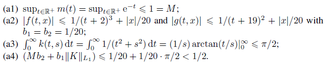 (iii) There are positive integrable functions ai ∈ L1 and constants bi ≥ 0 (i = 1, 2) such that |f (t, x)| ≤ a1(t) + b1|x|, |g(t, x)| ≤ a2(t) + b2|x| for all t ∈ R+ and x ∈ R.