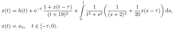 (11)It is clear that problem (11) is a particular case of problem (2), where ϕ(t) = x0 = const, m(t) = e−t, g(t, x) = (1 + x(t − τ ))/(t + 19)2, k(t, s) = 1/(t2 + s2), f (t, x) = 1/(t + 2)3 + (x(t − τ ))/20, and