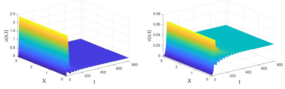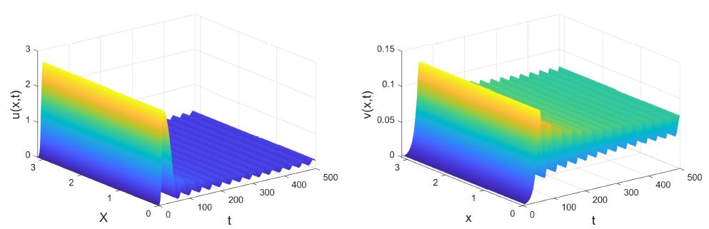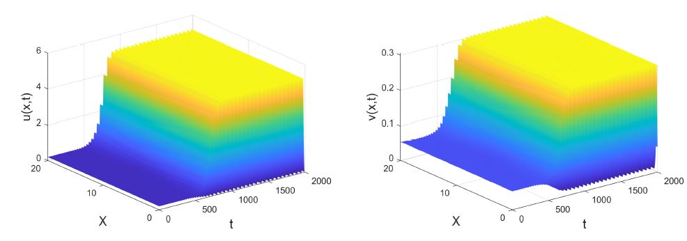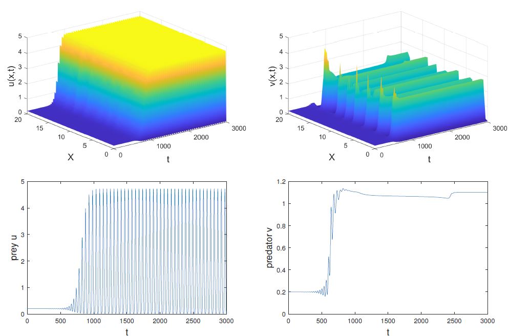 , while other parameters do not change, according to Theorem 5, system (1) undergoes spatial homogeneous Hopf bifurcation (see Fig. 7). It is shown that system (1) has spatially homogeneous periodic solutions emerged from the positive steady state
