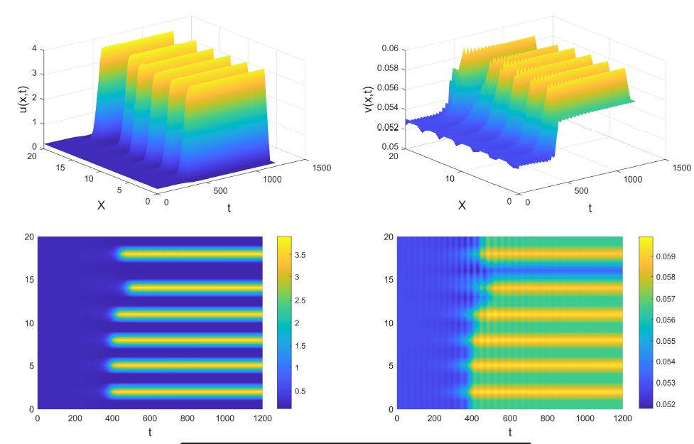 we find that the stable limit cycle is broken with the occurrence of spatial pattern (see Fig. 3), where the periodic pattern disappears and a strip pattern appears.