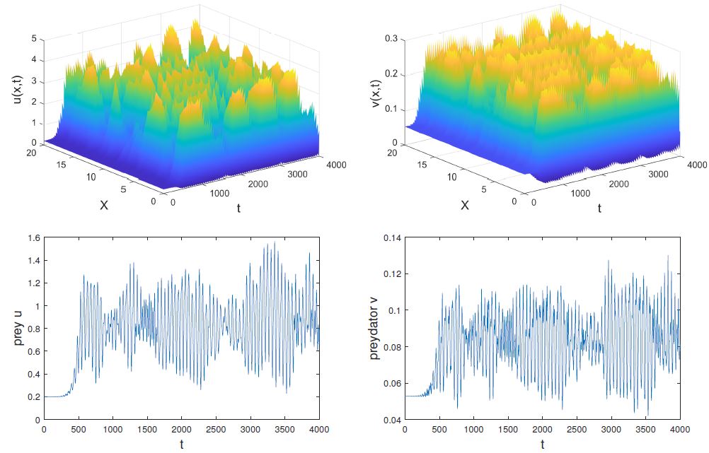 can lead to different spatial patterns, which can be periodic (Fig. 2), stationary (Fig. 3) and chaotic (Fig. 4). In addition, we also find that system has different spatial patterns with the different initial conditions (Fig. 5).
