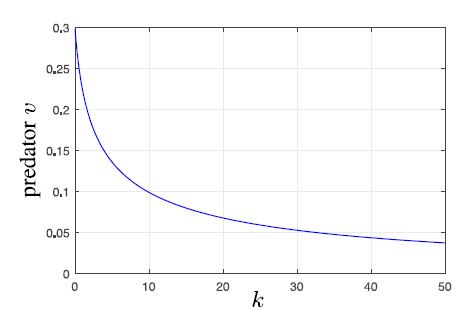 We further obtain that the fear effect can reduce the density of predator: with increasing the cost of fear, the density of predator population decreases at the positive steady state (see Fig. 8). From Section 5.2 it is obtained that the fear can prevent the occurrence of limit cycle oscillation and increase the stability of the system (see Fig. 9).