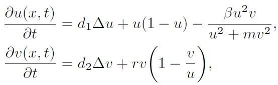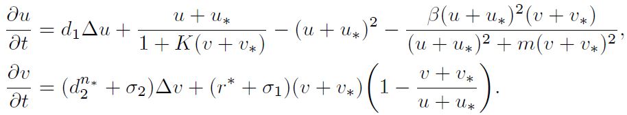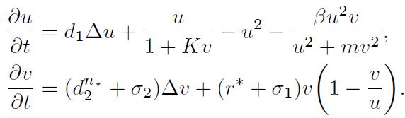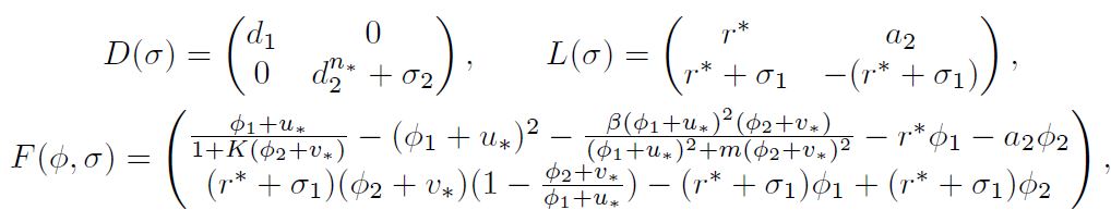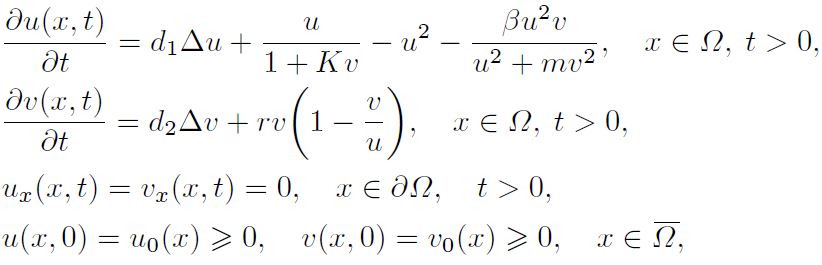 in (1) with a ratio-dependent functional response and considered its spatial distribution patterns and dispersal mechanisms. Making a suitable nondimensional scaling, system (1) reduces to