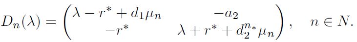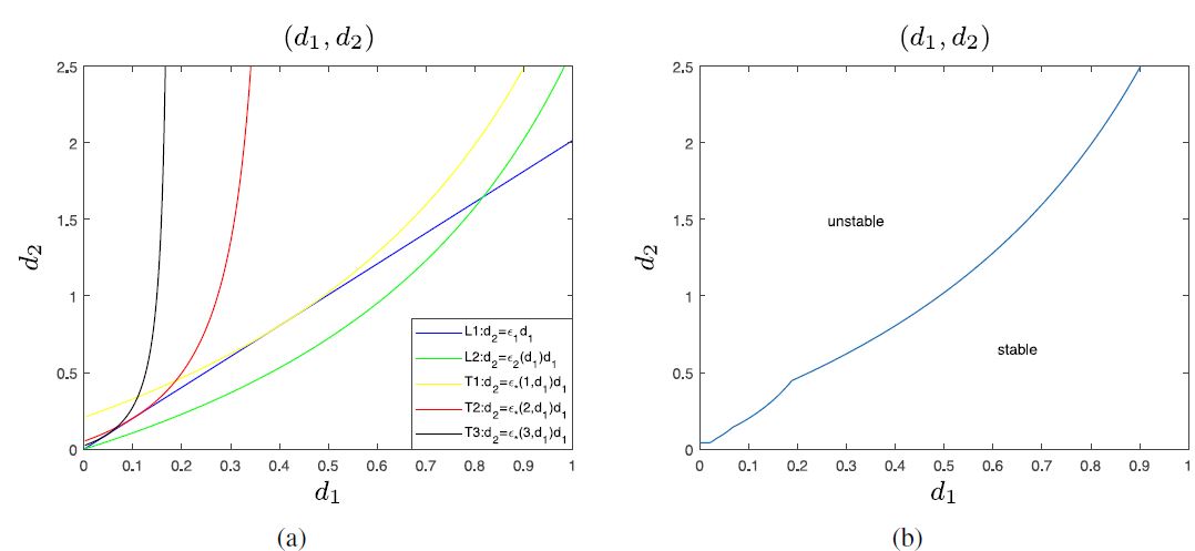 In this section, the existence conditions of the Turing instability are analyzed. Under the assumptions that (A1) and (A2) are established, it is known from Theorem 2 that there is
