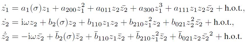 According to [7], the normal form restricted to the third order on the central manifold of the reaction–diffusion system (3) at the Turing–Hopf singularity is