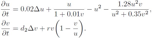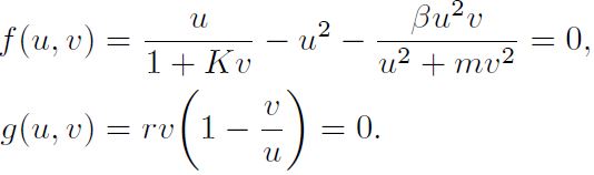 is known as the Leslie–Gower term [8], and it means the scarcity of prey leads to a loss of predator density [16]. There have been several reports on the dynamic behavior of this ratio-dependent predator–prey system (2). The Turing and Turing–Hopf bifurcations of system (2) were investigated and the spatiotemporal patterns of system (2) in two-dimensional space were discovered by Chen and Wu [3]. In [16], under homogeneous Neumann boundary conditions, the existence conditions of Hopf bifurcation, Turing instability of spatial uniformity and Turing–Hopf bifurcation in one- dimensional space were shown. In Chang and Zhang [2], they used the Leray–Schauder degree theory and the implicit function theorem to report the nature of the spatially homogeneous Hopf bifurcation and the nonexistence and existence of nonconstant steady states.