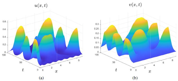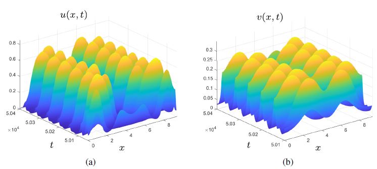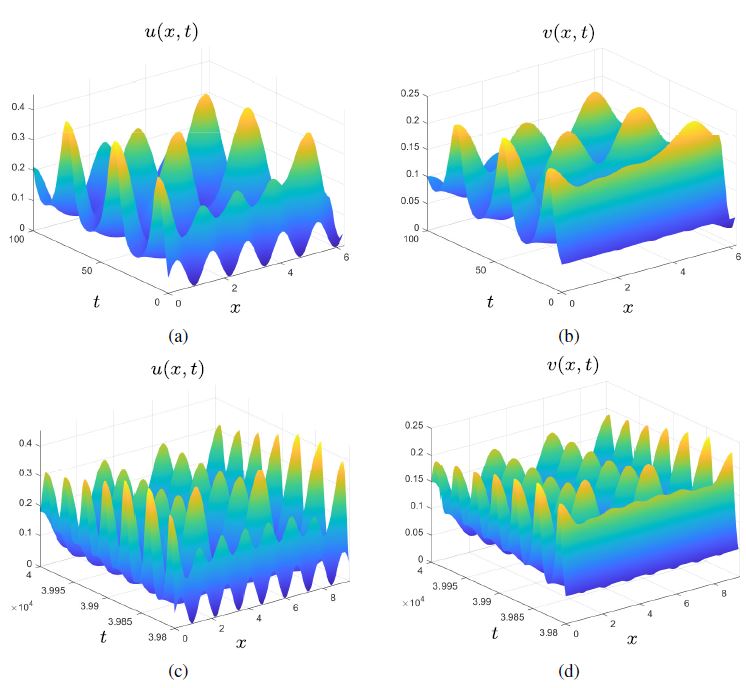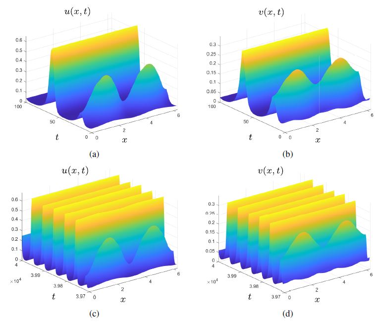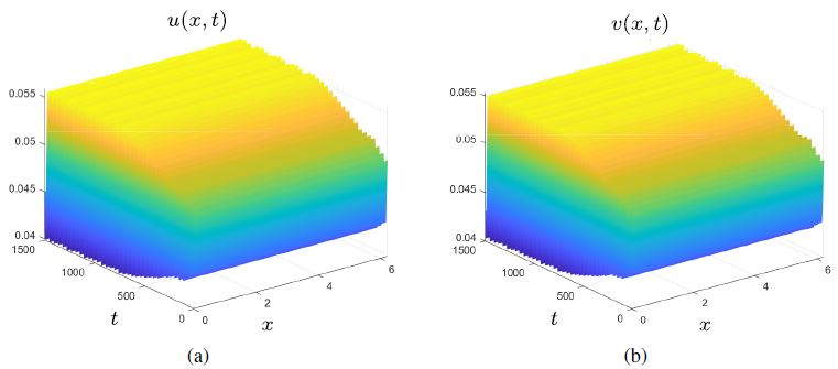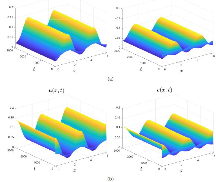 , system (3) has a pair of stable spatially inhomogeneous steady states (see Fig. 7). The spatial patterns and bistability are shown by system (3). When