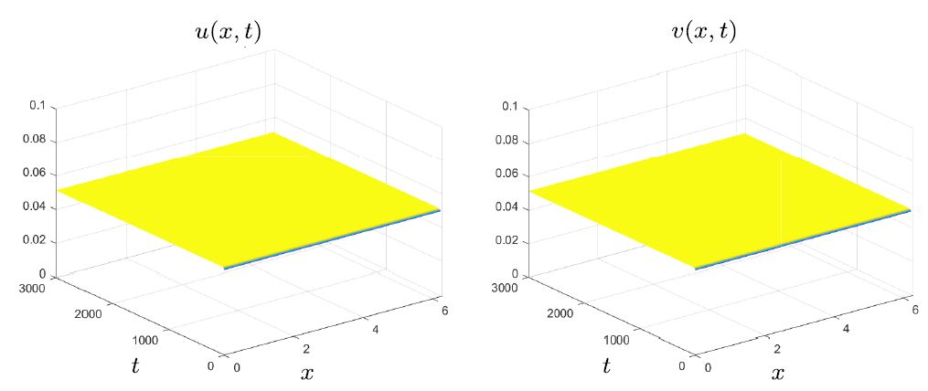 is chosen as the Turing–Hopf bifurcation point. Therefore, system (12) undergoes Turing–Hopf bifurcation at the point