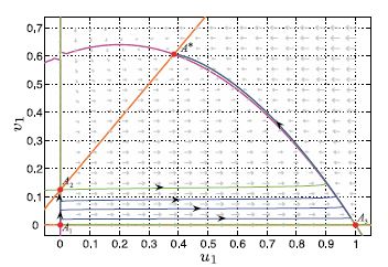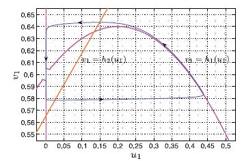 which allows assert that the value of decreases on segment and and increases on segment . Hence, system (14) has a stable equilibrium corresponding to and an unstable equilibrium corresponding to . Indeed, there exists a singular orbit from to .