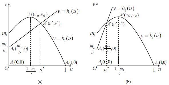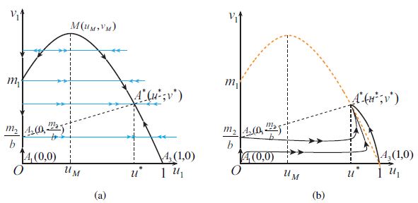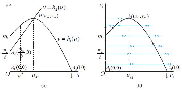If , system(10)has a unique positive equilibrium satisfying , where . Furthermore is a stable node located in the right branch of function for and is an unstable node located in the left branch of function for ; see Fig. 1. Here