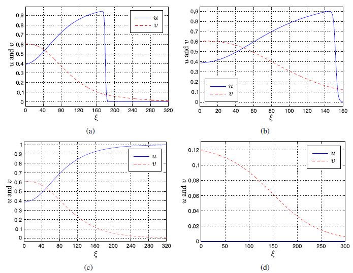 Example 1. Set and in (8). It is clear that there exist the positive equilibrium and the heteroclinic orbits in Lemma 1; see Fig. 3. The travelling waves of model (3) are shown in Fig. 4, which correspond to the heteroclinic orbits in Theorem 2.