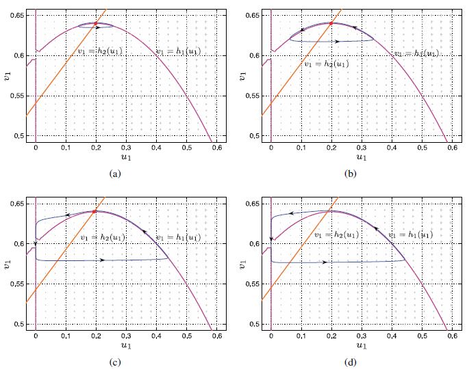 Theorem 5. For any fixed , there exists such that for , system (10)has a unique relaxation oscillation cycle in the -neighborhood of , which is hyperbolic attracting; see Fig. 8(b). Furthermore, the cycle converges to in the Hausdorff distance as .