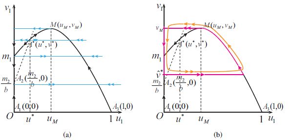 With similar analysis, we can get the dynamics of (12) on . Hence, the dynamics of (10) and (11) with are shown in Fig. 2(a). Moreover, we have the following lemma about the heteroclinic orbits of positive equilibrium .