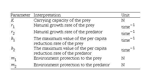 where U and V separately stand for the total numbers of preys and predators, all parameters are positive constants and their interpretations are described in Table 1.
