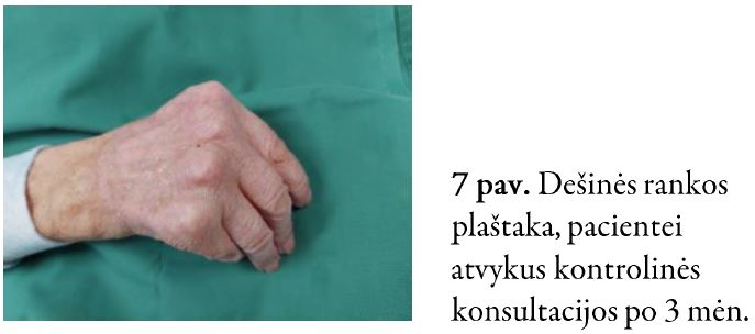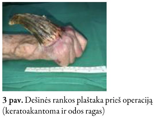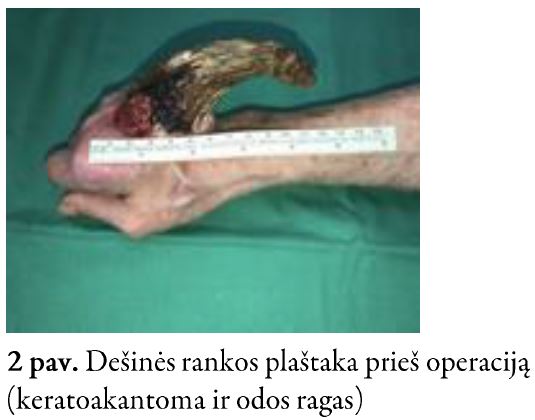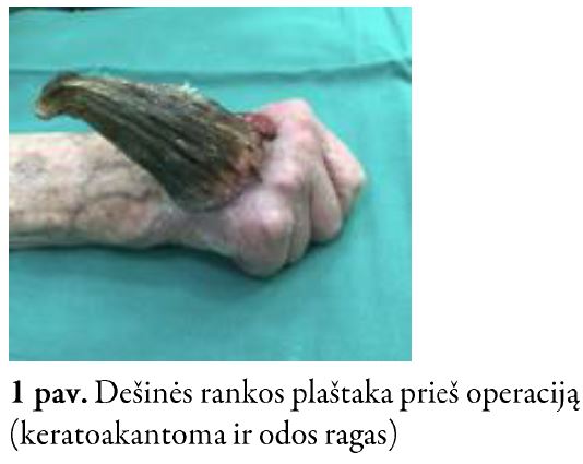 Į Respublikinės Vilniaus universitetinės ligoninės Planinės pagalbos skyrių kreipėsi 91-erių metų pacientė dėl dešinės plaštakos odos tumoro – rago, kuris atsirado 2018 m. rugsėjo mėn. Iš gyvenimo anamnezės žinoma, kad pacientė gyvena slaugos namuose, nekontaktiška. Odos ragas šalintas tris kartus, tačiau nuolat recidyvuodavo. Pacientė paskutinį kartą operuota 2020 m. rugpjūčio mėn., tačiau darinys vėl recidyvavo. Odos ragas atsinaujino ketvirtą kartą. Pacientė konsultuota plastinės rekonstrukcinės chirurgijos gydytojo. Indikuotas operacinis gydymas – darinio pašalinimas ir odos plastika. Pacientė hospitalizuota į Plastinės ir rekonstrukcinės chirurgijos skyrių operacinio gydymo.
