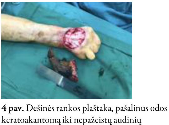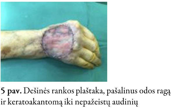 2021 m. birželio 1 d., taikant regioninę nejautrą, atlikta naviko šalinimo operacija ir viso storio odos transplantacija (4–5 pav.). Darinys ekscizuotas, pašalintas iki sveikų audinių. Defektui padengti iš dilbio paimtas 4x5 cm viso storio odos lopas. Odos transplantas persodintas į recipientinę vietą. Po operacijos pacientė gydyta antikoaguliantais, analgetikais. Atlikus histopatologinį tyrimą, rago apačioje rastas 2,2x1,5x0,5 cm rusvas plokštelės pavidalo židinys, matomas 0,3 cm iki rezekcijos krašto. Galutinė patologijos išvada – keratoakantoma, esant odos ragui ir plokščialąstelinės karcinomos židiniui G3, pT2 R0. Viename darinio šone pastebėta infiltratyviai auganti plokščiųjų ląstelių karcinoma, plintanti giliai į dermą.