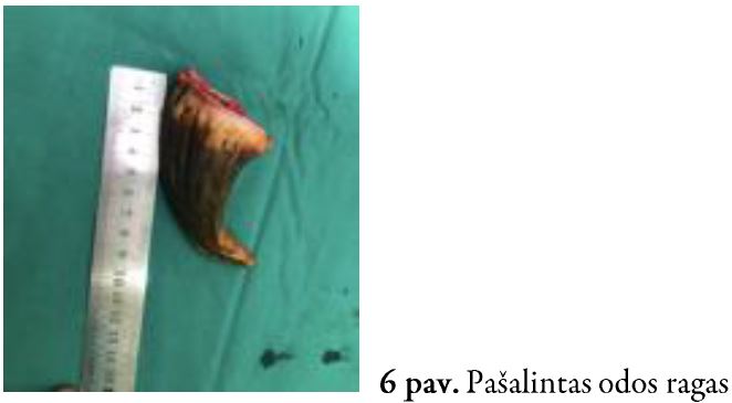 Išvada – darinys pašalintas radikaliai. Pooperacinis periodas sklandus, žaizda švari, nešlapiuoja. Pacientei atvykus kontrolinės konsultacijos po operacijos, matyti prigijusi oda, pastebimas nežymus randas (7 pav.).
