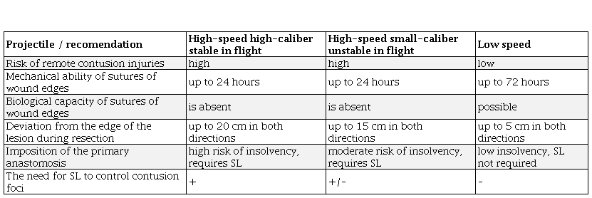 When the hollow organs are damaged by projectiles with low kinetic energy – the areas of primary traumatic necrosis and contusion of the organ wall are small, which allows to apply the primary suture to the wound after excision of its edges or to perform a limited resection of the intestinal segment. The risk of suture failure and remote contusion necrosis is small.