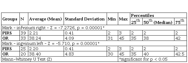 We also analyzed the participants in regards to the size of the mark, for which measuring of the mark in both directions was done: inguinum right and inguinum left. Differences between the groups related to the length of inguinum left as well as right was in favor of PIRS group (p = 0.00001) (Table 1).