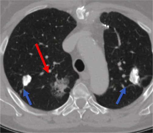 62-year-old female with smoking history of 35 pack years was referred to interventional radiology department for a biopsy of the right lung lesion. The lesion was found accidentally during CT investigation before planed aortocoronary bypass surgery. At 6-month follow-up the subsolid lesion remained stable while its suspicious appearance as subsolid nodule with ground glass area at its periphery indicated to perform a biopsy (Figure 1).