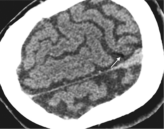 Immediate head CT was performed suspecting neurological pathology. Small air foci were found in peripheral area of left parietal lobe – a clear sign of air embolism (Figure 3). Patient was treated with 100% oxygen.